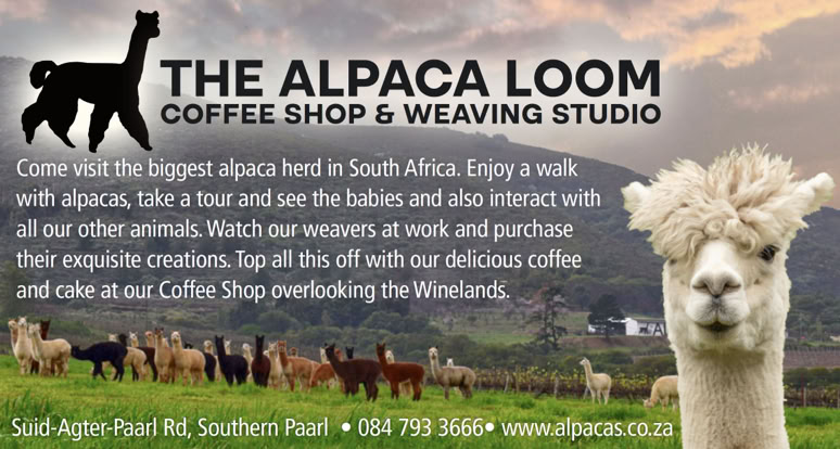 Visit South Africa’s biggest alpaca herd! Watch our weavers at work, join us on an Alpaca Barn Tour to see the youngest cria, enjoy a walk with an alpaca and interact with all the animals in the petting zoo.Delicious coffee and cake.Exquisite alpaca scarves, shawls, ponchos, blankets and knitwear produced locally. Location: Suid Agter Paarl Rd (off the R44) Information: Open daily 09:30 – 17:30, Alpaca Barn Tours every hour on the hour. Alpaca Walks 10:00 & 16:00 (by appointment only). • www.alpacas.co.za Price: free entry to the coffee shop and weaving studio. Small fee for the petting zoo and the tour or walk.