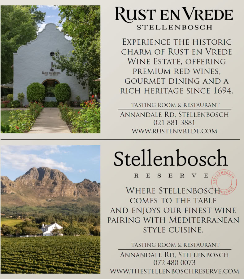 Discover Stellenbosch Reserve, nestled on the Helderberg slopes, where award-winning wines, Mediterranean-inspired cuisine, and breathtaking views come together. Originally founded in 2005 by Jean Engelbrecht, Stellenbosch Reserve produces wines that showcase the region’s rich terroir. The elegant Tasting Room and Restaurant provide a serene setting to enjoy dishes like wood-fired pizzas and slow-roasted Kalahari lamb, crafted with fresh, local ingredients.Stellenbosch Reserve invites you to unwind with a wine tasting, a leisurely lunch, or a cozy dinner, embracing the finest of the region’s rich heritage and culinary excellence. Location: Annandale Road, Stellenbosch Information: restaurant@thestellenboschreserve.com • www.thestellenboschreserve.com 072 480 0073 Price: free to visit/ fee for tours and restaurant