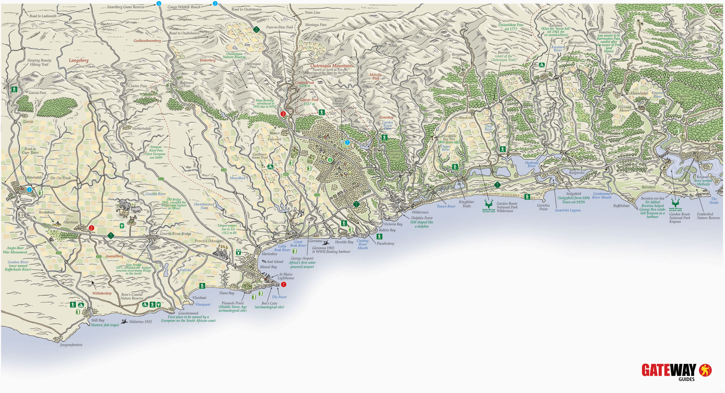 This guide takes the form of a road trip following the N2 as the main route from west to east, as this is the direction in which the history of the area unfolded, (even though the Portuguese used Mossel Bay and later Plettenberg Bay for supplies – without actually occupying the territory – before the expansion from the Cape). The Garden Route officially starts at Riversdale and ends just over 300 km away at Storms River. The dry rolling hills from Riversdale to Mossel Bay seem very different from the lush forests of the later part of the journey bu in terms of geologythey share the same features. The mountains on the left are a continuous ripple of the Cape Fold Mountains (consisting of hard sandstone). These mountains were buckled, bent and folded when South America and the Falkland Plateau smashed into Africa when the continent of Gondwana was formed 180 million years ago. On the right is the Atlantic coast that, by contrast, was formed when Gondwana finally broke up and drifted apart 60 million years later. The land between the mountains and the sea varies in width from 45 km to a mere 5 km (The narrower the gap, the more chance there is of forests). This coastal plateau, 200 m above the sea, was once a wave-cut platform, under water when sea levels were at their highest 20 million years ago. At its lowest, the present shoreline varied between 2 km and 30 km out to sea.
