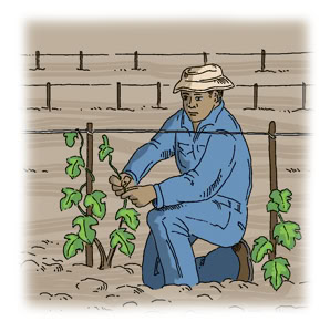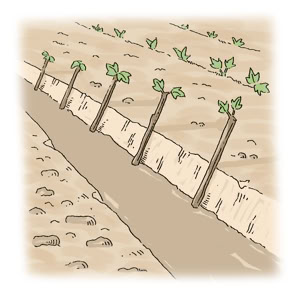 Second ploughing is done. Young vines are attached to pegs to form a straight line. Dead vines are replaced. Insect control is undertaken. In trellised vineyards, the shoots are removed from the stem.