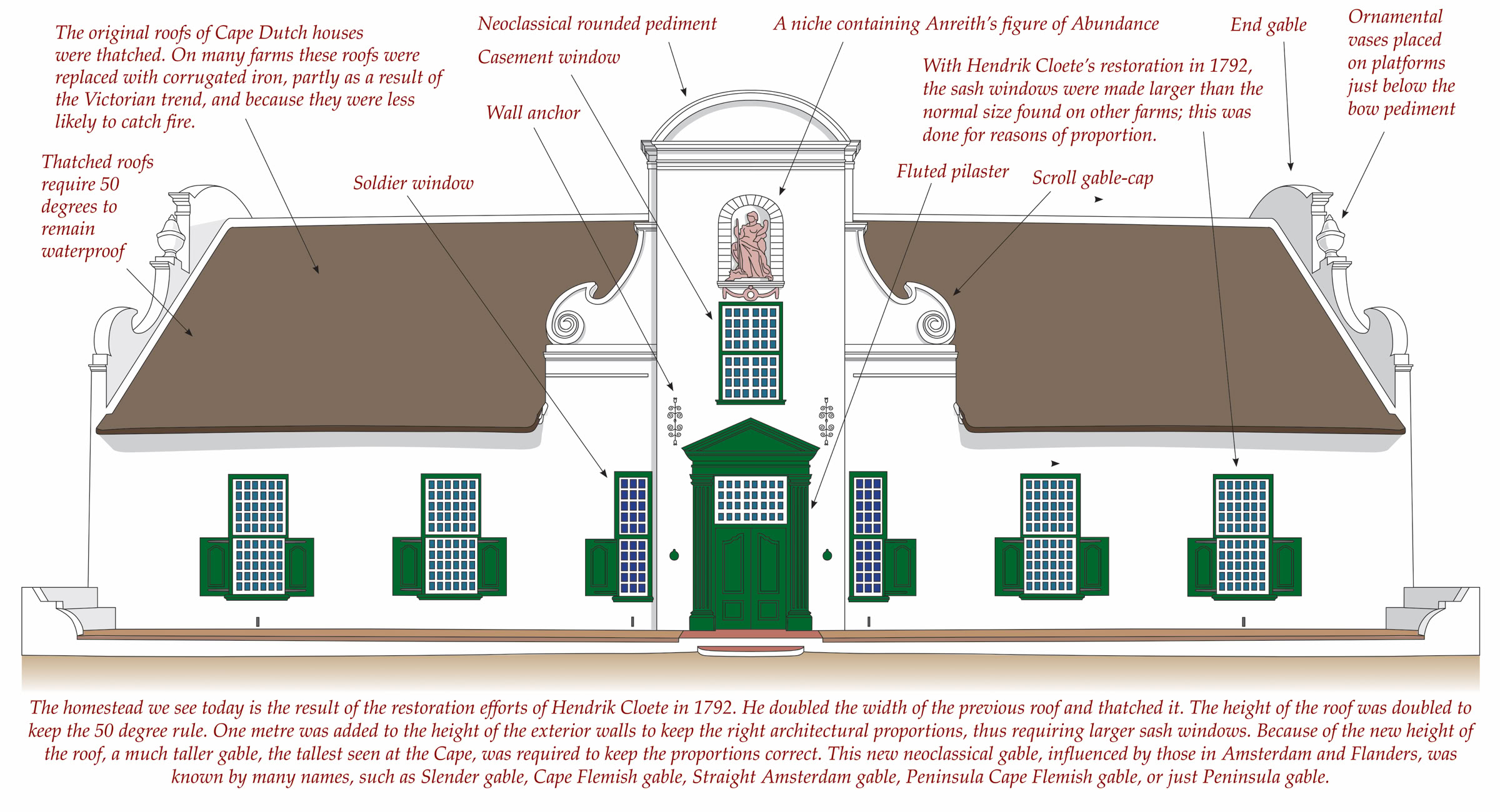 The new wealth resulting from the export of wine was reflected in the homes of the farmers. Homesteads became bigger; the once simple oblong houses changed into bigger U-plans, T-plans and H-plans. The most obvious feature reflecting the new-found wealth was the use of embellished gables. Fashions in Europe influenced the design of the gables at the Cape but a unique local flair was added, as the craftsmen (mostly from the Far East) were ex-slaves and tradesmen whose cultural influence crept into the designs. Hendrik Cloete plastered and white-washed Van der Stel’s red face brick house. He kept the layout of the farm buildings but renovated them in the Cape Dutch style. He added the large wine cellar behind the manor house, sparing no money. He probably used the most celebrated architect of the time, Louis Michel Thibault, and had Anton Anreith create the stucco relief above the front door of the wine cellar. He raised the manor house by making the ground floor into cellars, the old first floor becoming the ground floor. The ground in front of the house was built up to accommodate this change. The house was widened and the roof made higher. Then he added a most beautiful neoclassical gable of the rare halsgewel type that was taller than any in the Cape.