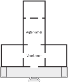While the U-Plan was developing in Cape Town, the T-Plan was evolving in the rural areas. This design consists of a voorkamer, agterkamer, a kitchen at the end with a built-in chimney and two front rooms off the side of the voorkamer.