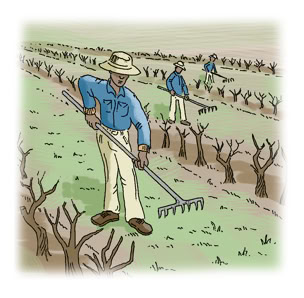 New vineyards are watered if dry. Missing vines are replaced. Cleaning around vines is done. On windless days dusting of vines is done to prevent diseases that could destroy the vines.