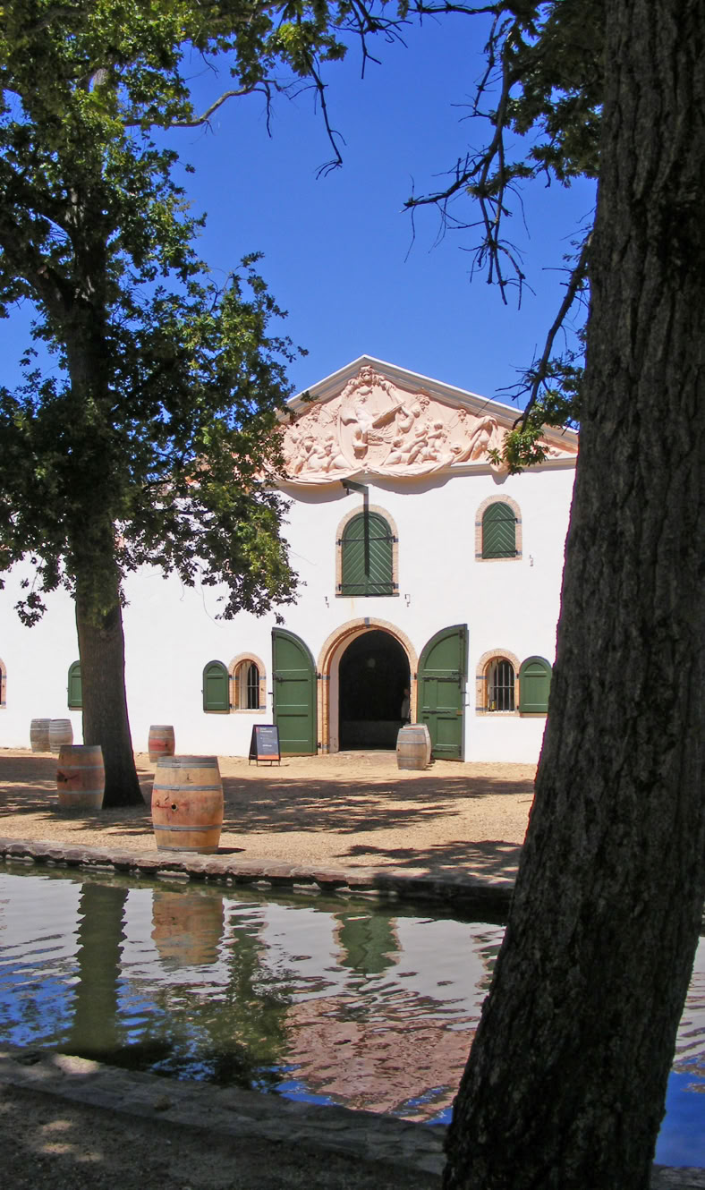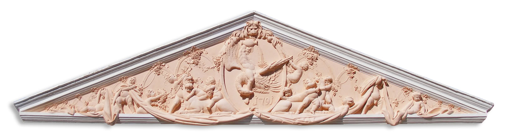 Anton Anreith’s 1791 Rococo-style stucco relief of Ganymede, cup-bearer to the gods, with cherubs adorns the Cloete Cellar pediment.