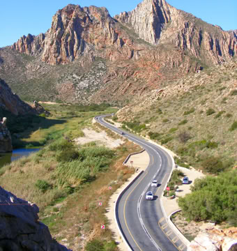 Most visitors to the R62 will be departing from Cape Town, which is a spectacular journey in itself. The most direct route, at a distance of 173 km, would be via the N1 to Paarl, through the tolled 3.9 km Huguenot Tunnel which opened in 1988. The more scenic free route would be to go over the mountain via the 1948 Du Toitskloof pass. Both routes display the breathtaking sceneryof the inner Du Toitskloof valley and the broad Breede River valley.