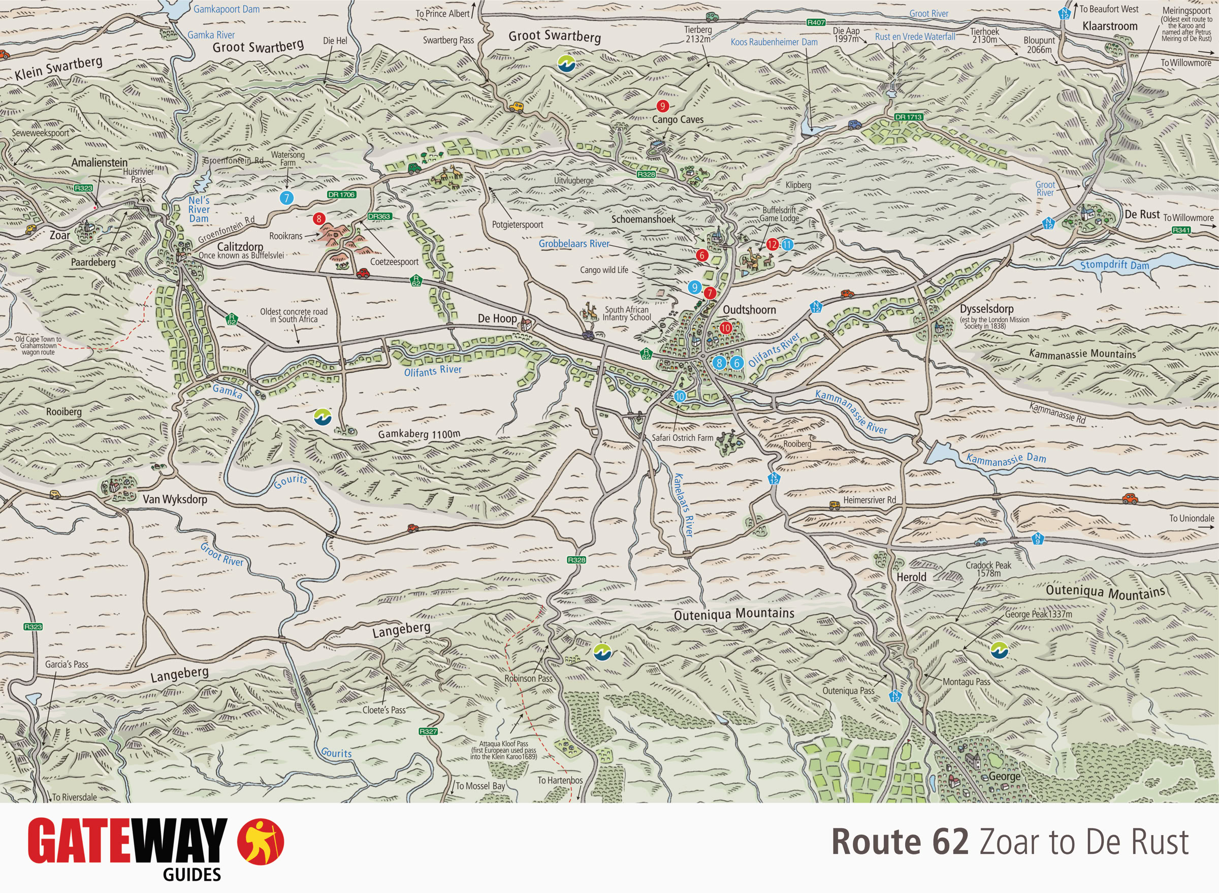 It was only in 1978 that the R62 was tarred and the new Huisrivier Pass, built in 1966, truly connected the Calitzdorp side of the Klein Karoo to the western part of this region.R62, as a tourist destination, took off in the post-apartheid era (1995) when many foreign tourists flocked to South Africa and tour operators saw the wisdom of including R62 as part of their Garden Route tour, thus including Cango Caves and the ostrich farms as a starting point.
