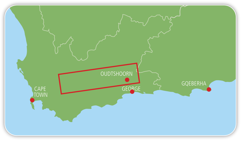 15 km after leaving Calitzdorp on the R62, keep your eyes on the left for the Rooikrans (Redstone Hills). It is worth driving down this gravel road to get up close to one of the finest conglomerate rock formations in South Africa. Back on the R62, you pass De Hoop (1908) with its conspicuously oversized church for its small community. This settlement was founded on theostrich feather boom. Another 15 km on from De Hoop, you arrive at the capital of the Klein Karoo.
