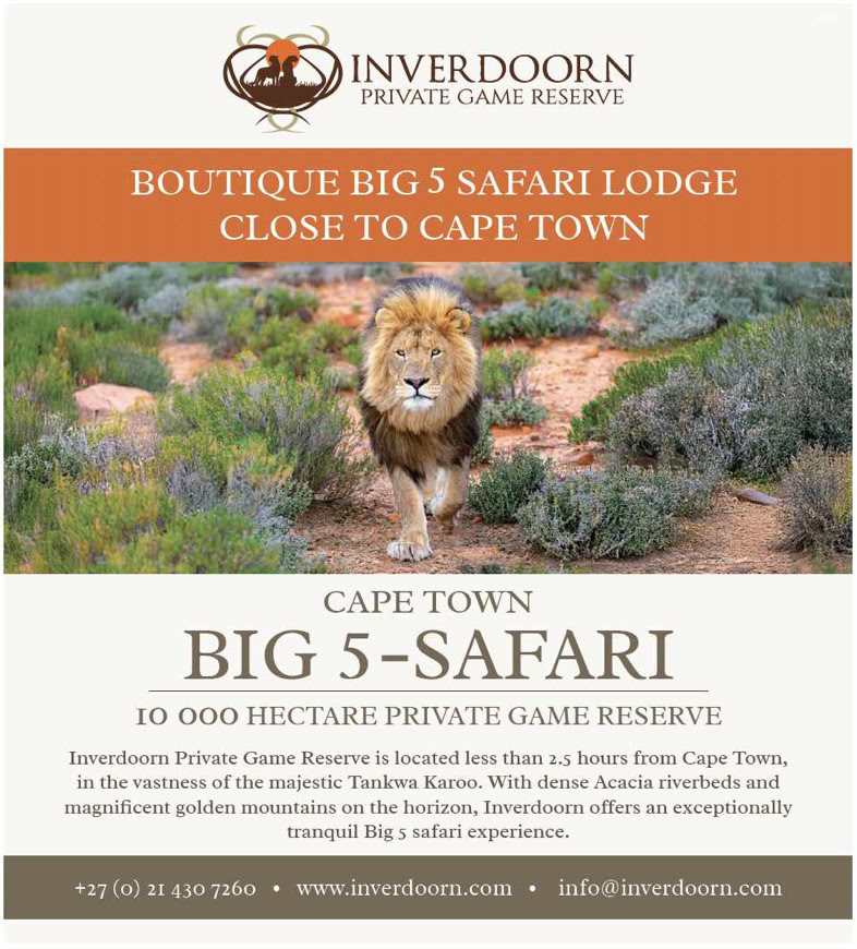 Ladismith is reached in less than an hour with the iconic backdrop of the Towerkop Peak. There are twointeresting tales about this peak. Firstly, it is thought that the name comes from a legend that a witch was flying over the mountain and the peak got in the way so she split the mountain in two so she could pass through it. The second but verified story is about a young local man, Gustav Nefdt, who was the first person to climbTowerkop in 1885. He had solo-climbed the routewith no rope and, at the time, it could be considered one of the hardest technical rock climbing routes in the world.