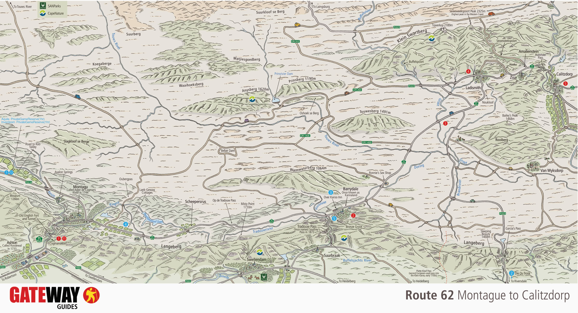 Today, the R62 is marketed as the longest wine route in the world, stretching from before Montagu all the way to Gqeberha (Port Elizabeth) and is atourist destination in itself, just like the famous Route 66 in America which was the inspiration for the R62.This guide, as you will note, does not cover the whole ofthe R62 tourist route as it is just too long for one guide to do it justice, so it sticks mainly to the original road that is designated as the R62 starting just before Cogmanskloof and ending at Oudtshoorn and its surrounding areas.