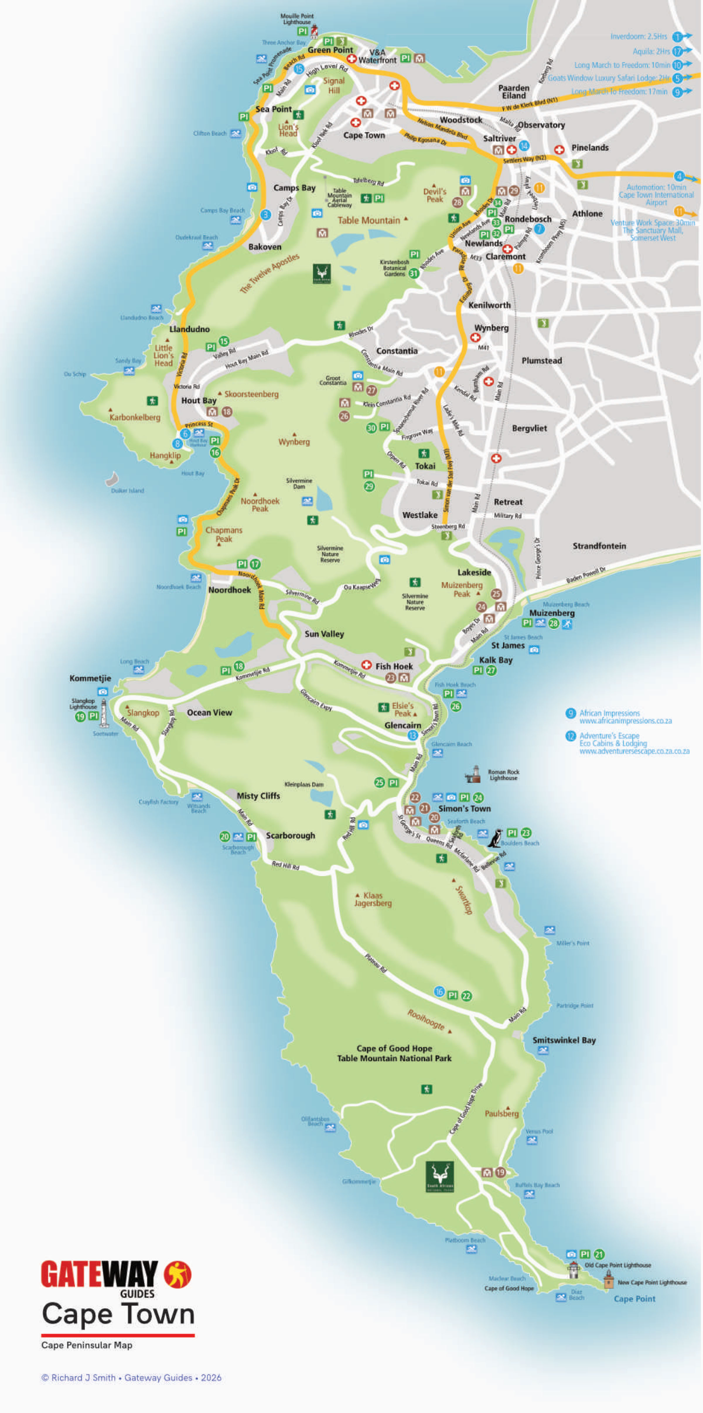 The official name is the Cape of Good Hope Nature Reserve. What more can be said than that it is the most visited tourist hotspot on the Cape Peninsula after the Waterfront. It is the most south-westerly point of Africa and also the most southerly point of the Peninsula. As well as visiting the Point, there is a whole game park to explore.