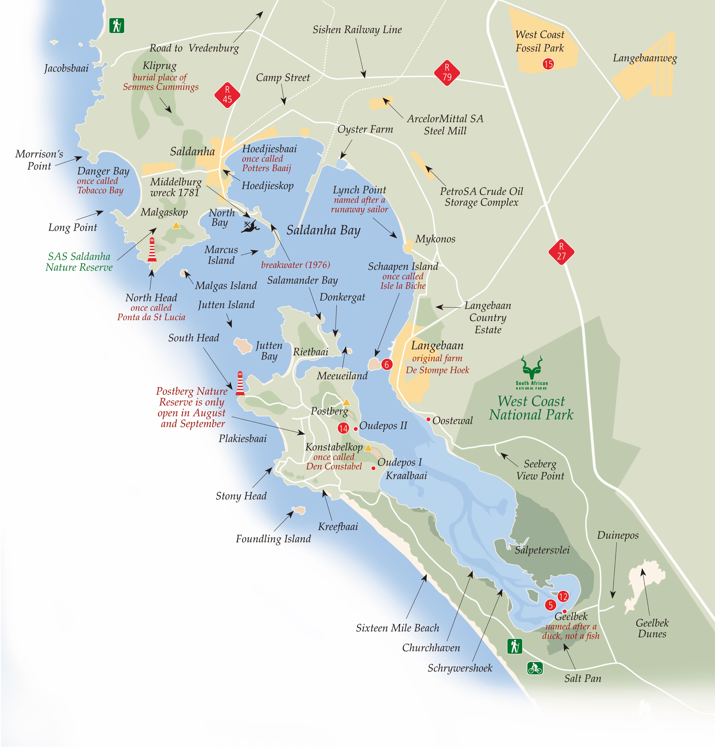 Jacobsbaai: Now a holiday and retirement destination, it was once a safe haven for fishermen who could not get back to Saldanha in bad weather. One of its first residents was a Swede who lived like Robinson Crusoe for 30 years. The Stephan brothers had a 99-year lease on the bay for the sole purpose of stopping any other marine business using it; this expired in 1990.